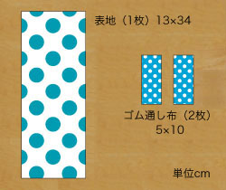 1.裁断本体の生地は13×34cm、ゴムを通す部分の生地は5×10cmに裁断します。(縫いしろ込み) |