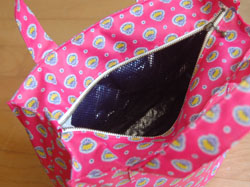 | サンプルとして作った「角が決まるファスナー付きビニコトート」を保冷バッグに改造しました。 これは思い立って、15分ほどで作ったものです。 |
