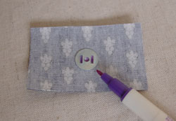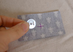 2.取り付け位置に印をつける ここでは、分かり易いように大きく十字に印をつけていますが、目打ちで中心に一刺しするだけで十分です。 写真では接着芯が不要なビニールコーティング生地を使用しています。布帛を使用する場合は、取り付ける生地の裏に厚手の接着芯を貼って補強してください。 |