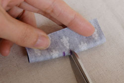 写真では接着芯が不要なビニールコーティング生地を使用しています。布帛を使用する場合は、取り付ける生地の裏に接着芯を貼って補強してください。